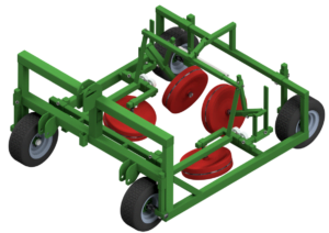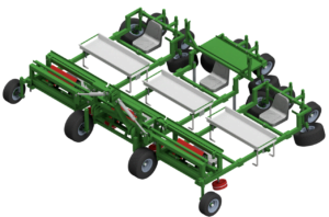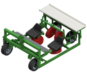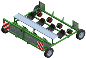 The planting trolley drives over the bed. The first pair of red balloon wheels press the planting holes through the sides. The second pair of balloon wheels press the plants via the top. This secures the plant in the soil. The pressure wheels are designed to follow the bed and absorb any steering movements. In the version with seat and plant rack, the plant is first planted manually and then immediately pressed.